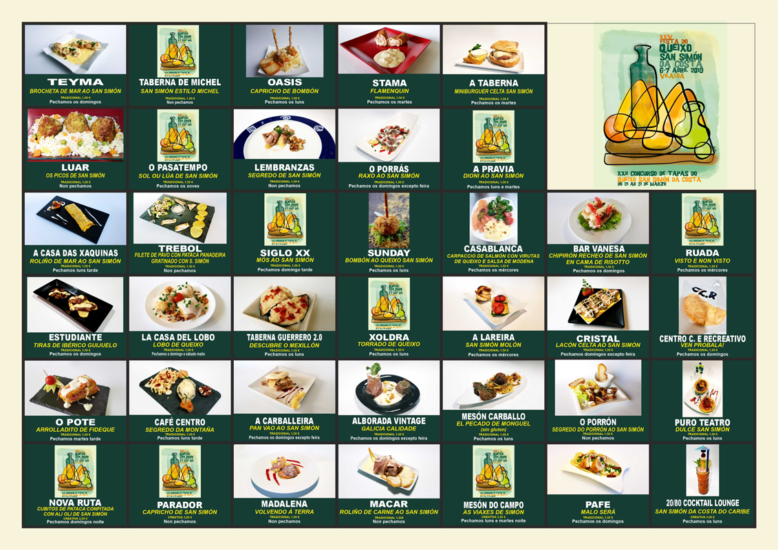 VI Concurso de Tapas con queso San Simón da Costa en Vilalba, del 21 de Marzo hasta el 31 de Marzo (ambos inclusive). Como parte del programa de la Fiesta del queso San Simón da Costa; que tendrá lugar los días 6 y 7 de Abril, 43 establecimientos de la localidad ofrecerán sus tapas con dicho queso como protagonista dentro de dos categorías diferenciadas: Creativa y Tradicional.
